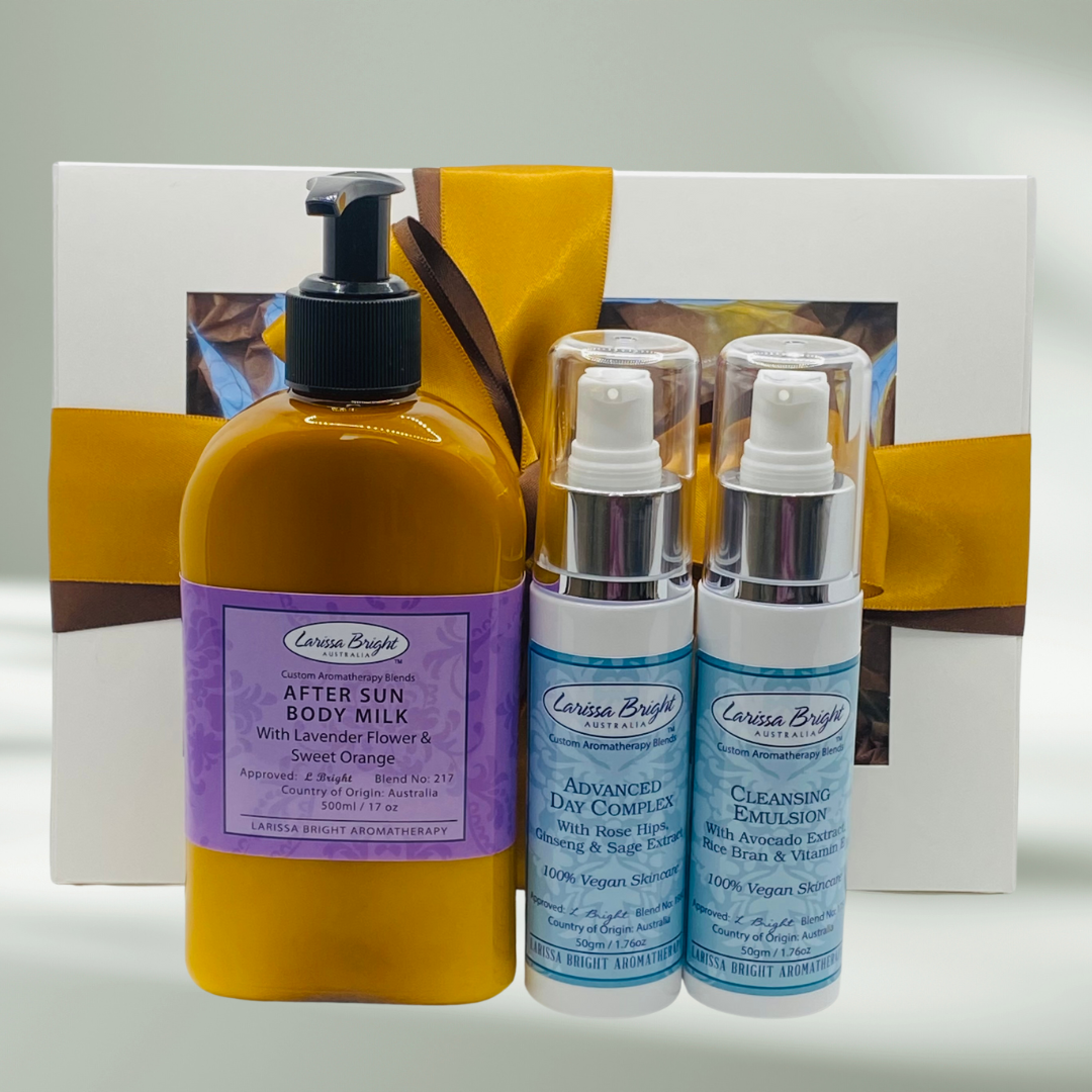 The perfect gift to nourish your skin. Includes our ever so popular After Sun Body Milk. Our body milk is highly moisturising. Made with Lavender Flower & Sweet Orange essential oils it smells simply divine. Also included is a beautiful, gentle Aloe Vera Juice & essential oil facial Cleanser & facial Moisturiser.